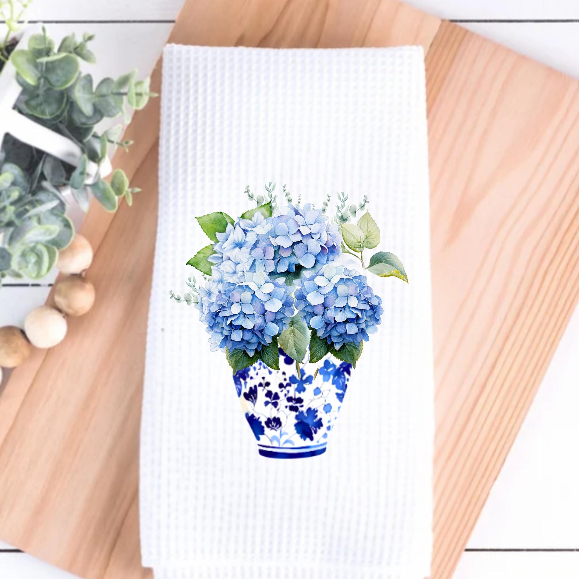 Personalized Hydrangeas In Blue Chinoiserie Vase Tea Dish Hand Kitchen Towel, Floral Kitchen Towel Decor Gift, Hostess Housewarming Gift