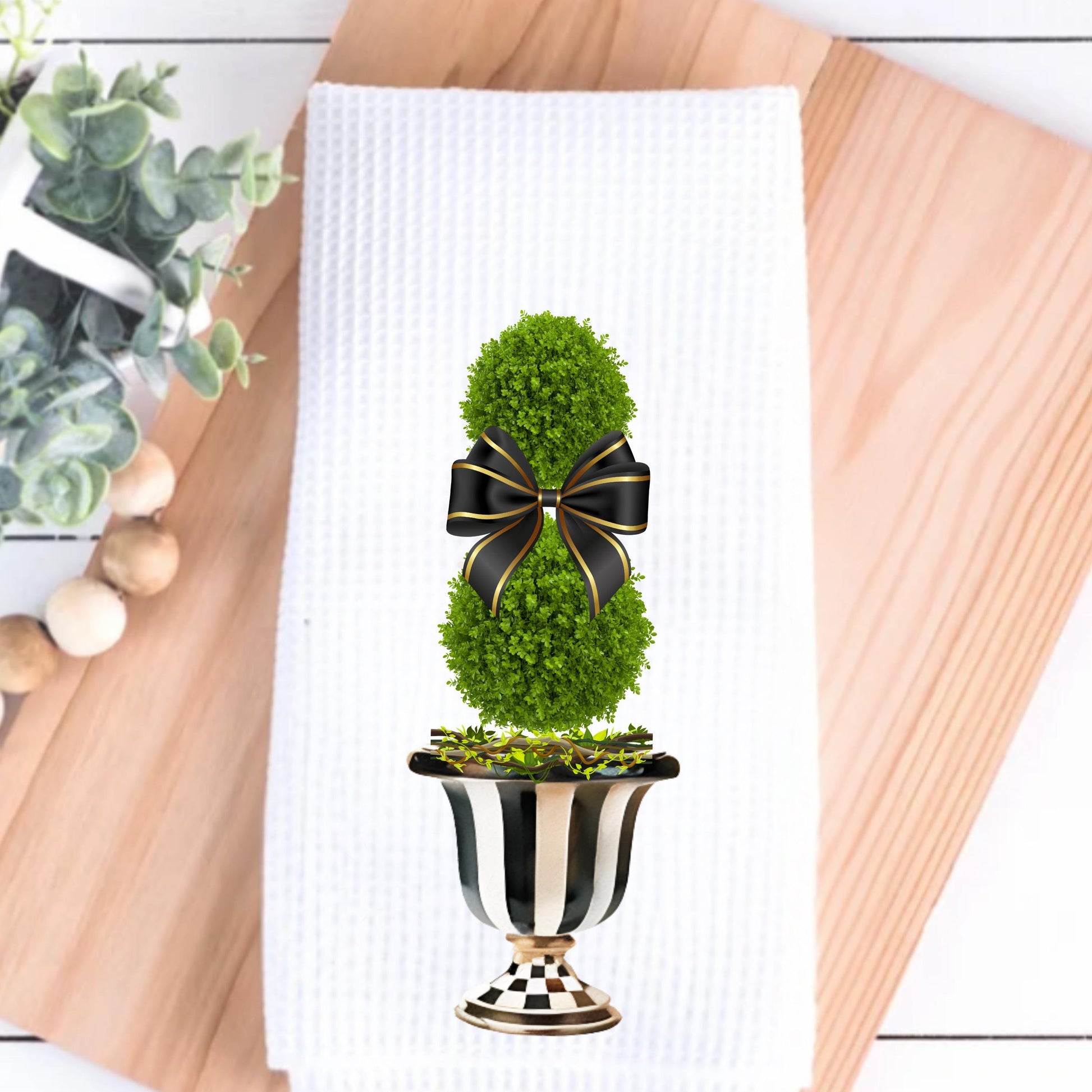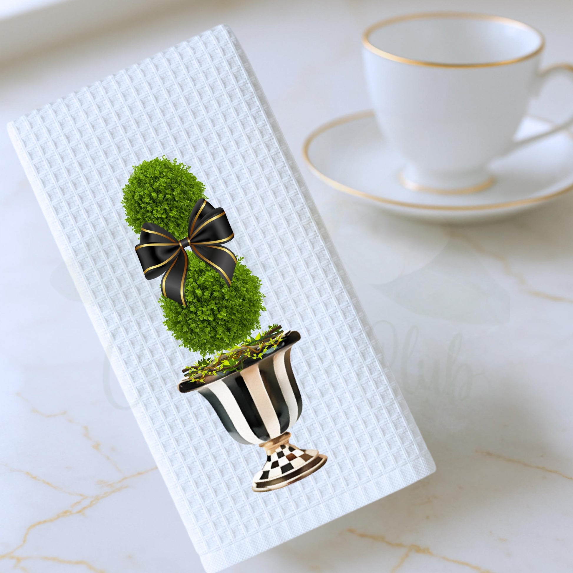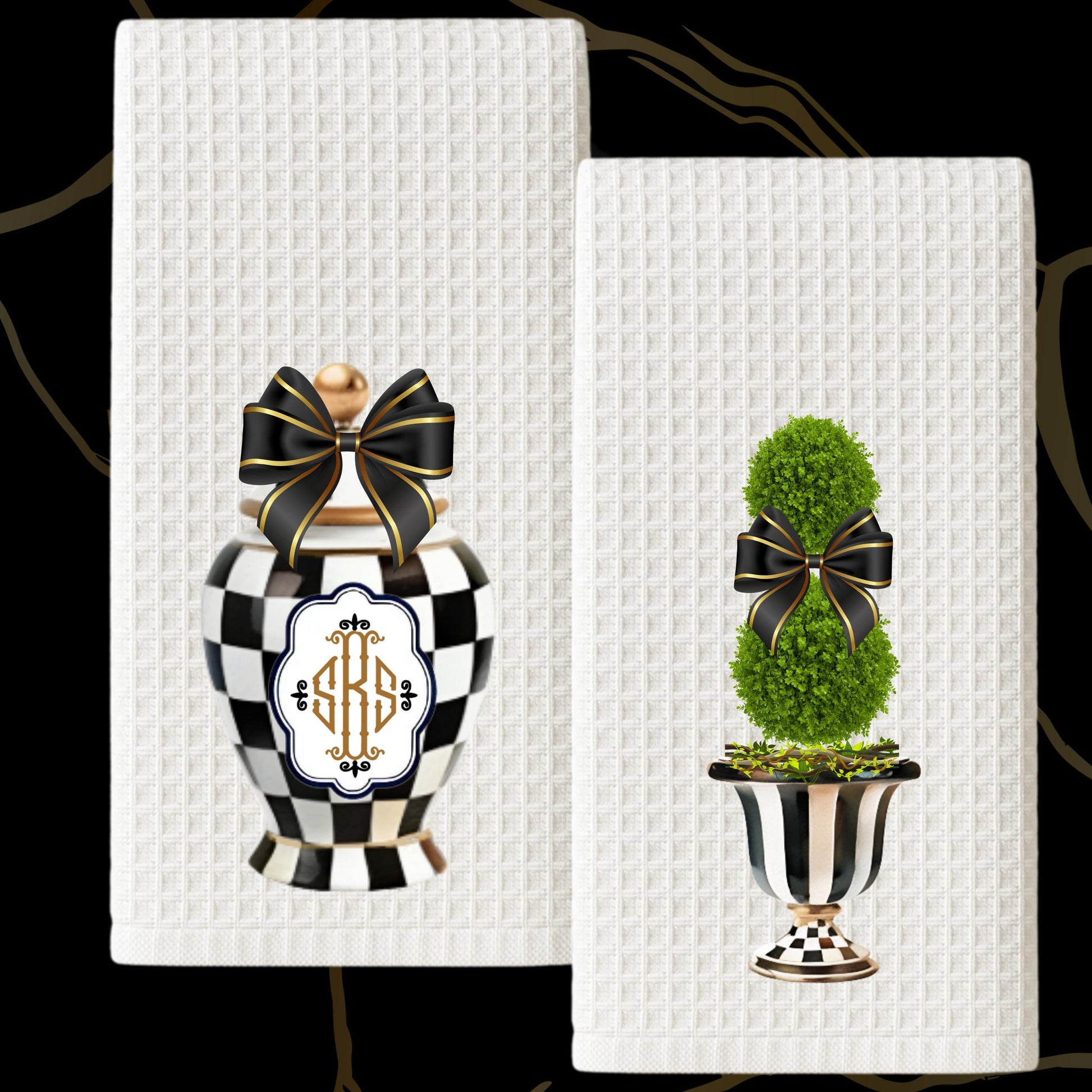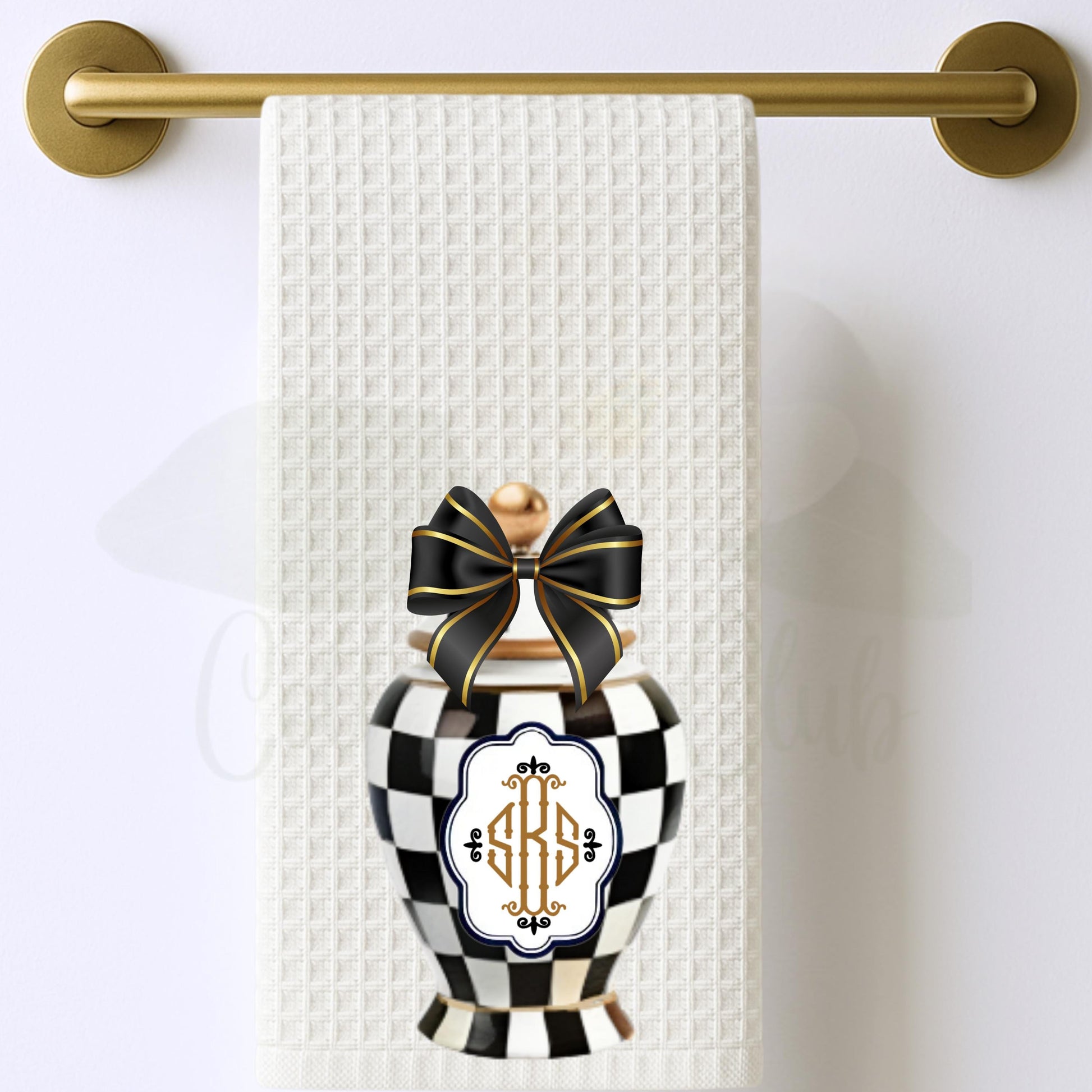 Add a touch of elegance and personality to your kitchen with our Personalized MacKenzie Childs Courtly Check Tea Towel. Featuring a classic black and white Courtly Check pattern, this charming towel is perfect for elevating your everyday kitchen decor or gifting to someone special. Whether you‘re celebrating a birthday, hosting a fall or Halloween gathering, or searching for a delightful hostess or gift for her or mom, this custom tea towel is a versatile and thoughtful choice.