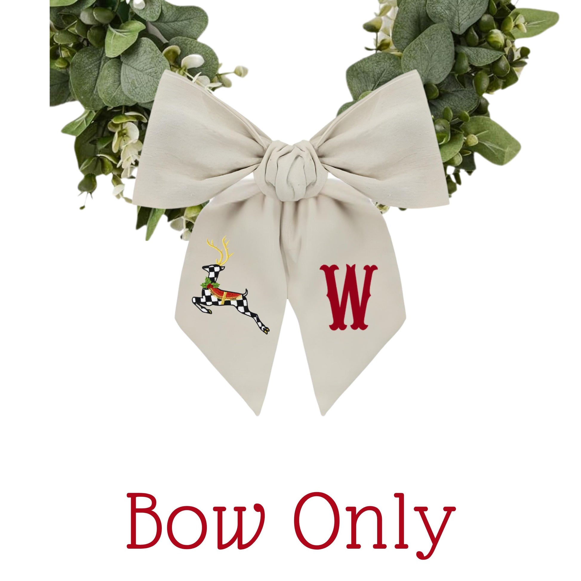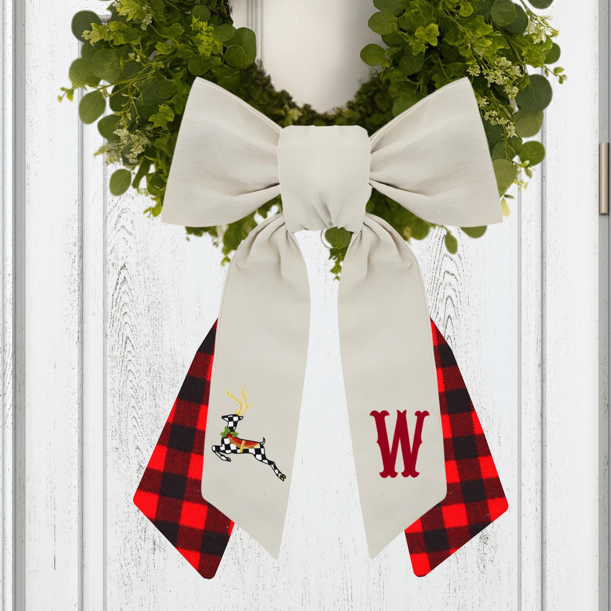 Black & White Courtly Check Embroidered Christmas Wreath Sash: Coordinating Sash Available - Holiday Door Hanger - Personalized Deer Door