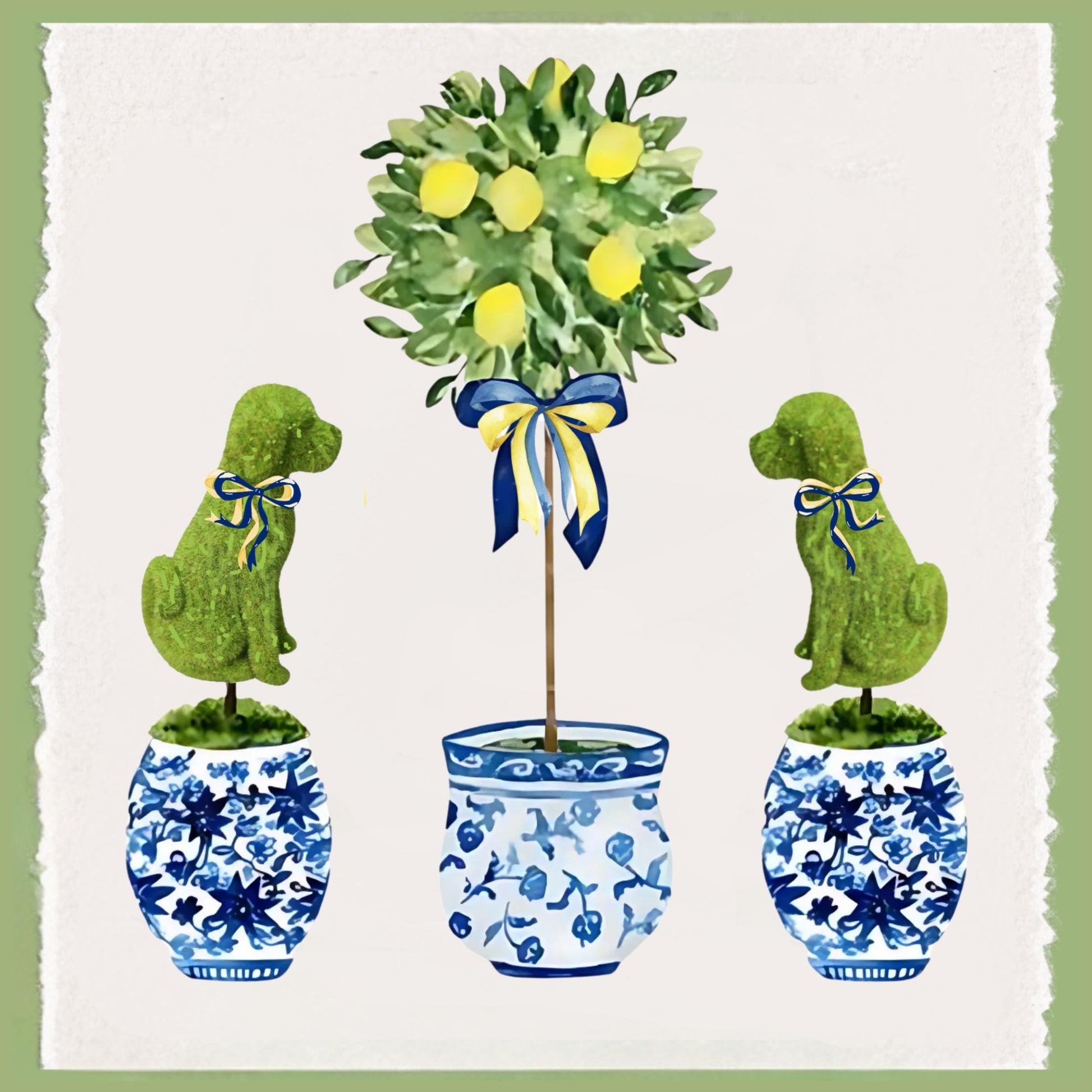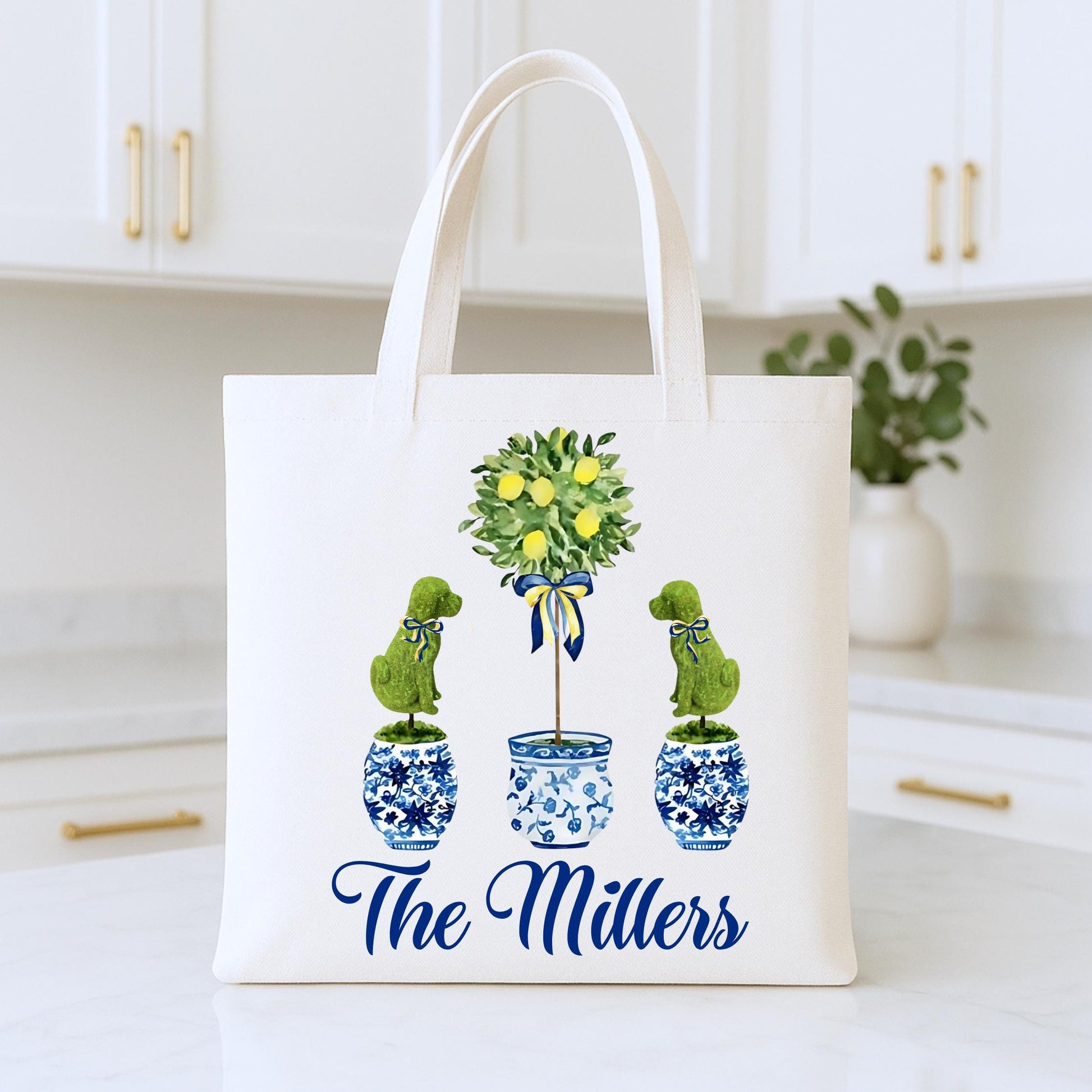 Dog Topiary Chinoiserie Tea Towel Personalized Gift Preppy Kitchen Decor Hostess Birthday Gift For Her Blue and White Grand Millennial